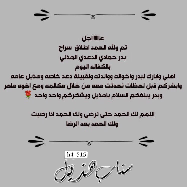 منصة هذيل الرسمية On Twitter ولله الحمد تم اطلاق سراح الشاب بدر بن حمادي الدعدي الهذلي نه ني ونبارك لبدر واخوته ووالدته وقبيلة دعد خاصه وهذيل عامة بمناسبة خروجه Https T Co C858kmbfqc